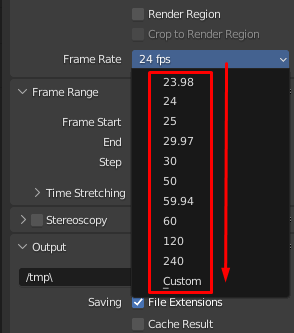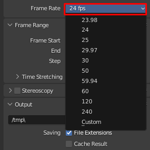Step 3: Once you click on the Custom, the FPS option will appear. On the FPS option, you could enter your desired Frame Rate. By default, Blender's frame rate is 24.