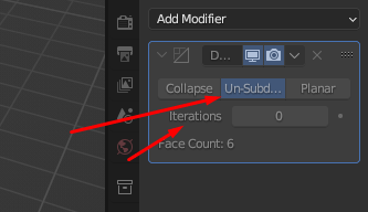 Step 3: To unsubdivide, switch from the collapse option to the unsubdivide option. Once you select the unsubdivide option, you get a new window (see the picture below). In the picture below, the iteration is 0, and the number of faces of the model is 6 (in our case, it is a regular cube).