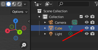 Step 3: In the outliner window, you can see the eye option on the right side of the cube, along with the camera, light, and collection. You have to click on the eye option to unhide an objective.