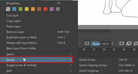 Then select all the layers from the bar of the layers as shown in the screenshot below. Now click the right button on the mouse and select group from there. Next, another dropdown menu will select the quick group option, and all the layers will come under a group.